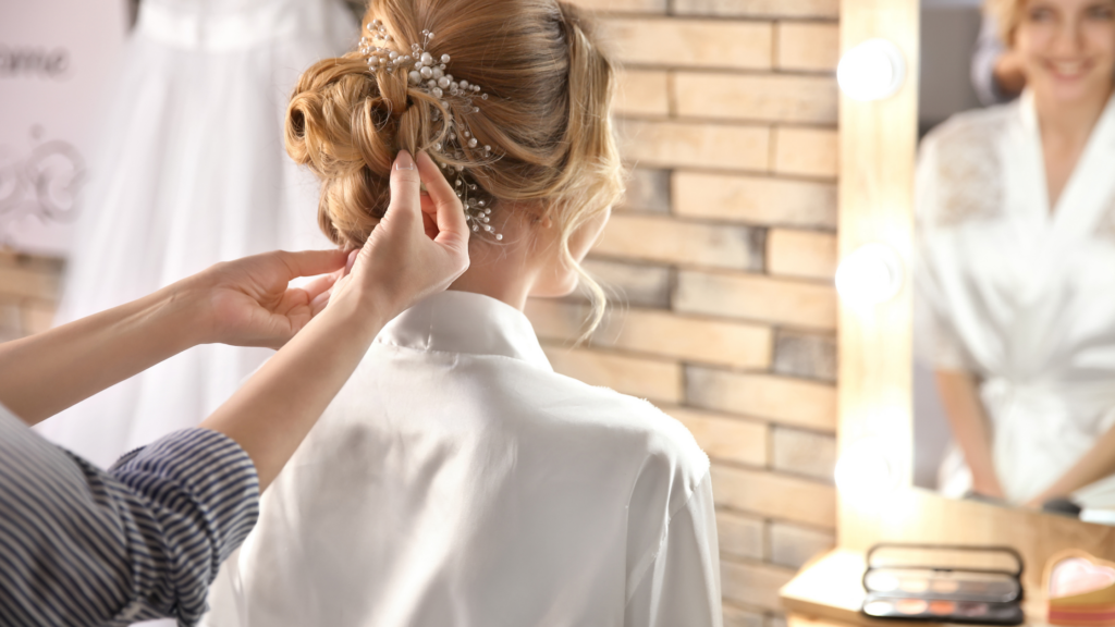 その後、ヘアメイクの施術に入ります。ベースメイクから丁寧に整え、用途や顔立ちに合わせてポイントメイクを調整しながら進めていきます。ヘアセットも、衣装や全体のイメージに合わせてバランスをとりつつ仕上げていきます。